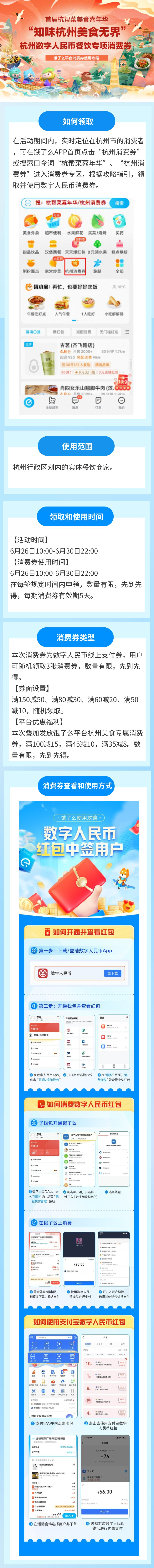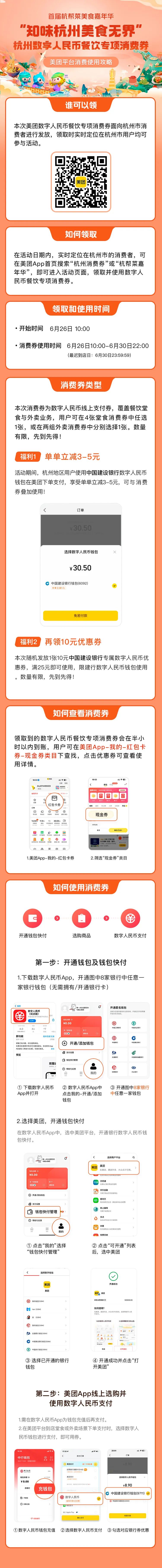 6月21日19:30—6月30日22:00,杭州将发放2023年“知味杭州 美食无界”杭州数字人民币餐饮专项消费券,发放总额为1000万元,分两轮发放,这也是首次全部以数字人民币形式发放餐饮消费券。第一轮数字人民币餐饮专项消费券已发放完毕,第二轮发放时间为今天(6月26日)上午10:00。