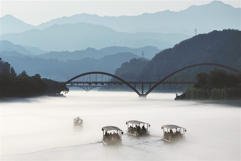 杭州日报讯 昨日清晨,参加体验的游客乘坐全新推出的“竹筏”造型电动游船,在建德新安江上缥缈的江雾中前行,欢享清凉之旅。作为今年建德市“看亚运 游建德”体验游的新项目之一,首批10条“竹筏”从今天起正式投入营运。新安江水源自约70米深的千岛湖底层水,水质清澈,水温常年在12℃-17℃,当江水与空气温差较大时,便会在江面上形成一层雾气。