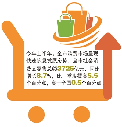 消费兴,则经济活。今年上半年,全市消费市场呈现快速恢复发展态势,全市社会消费品零售总额3725亿元,同比增长8.7%,比一季度提高5.5个百分点,高于全国0.5个百分点。