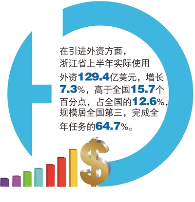 在引进外资方面,浙江省上半年实际使用外资129.4亿美元,增长7.3%,高于全国15.7个百分点,占全国的12.6%,规模居全国第三,完成全年任务的64.7%。