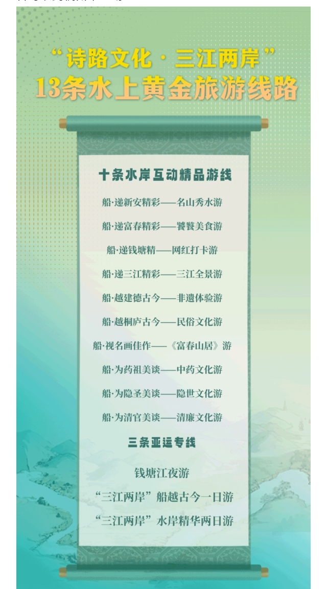 日前,杭州发布了“迎亚运——三江两岸20·23焕新游”,推出了13条“诗路文化·三江两岸”水上黄金旅游线路和10条“诗路文化·三江两岸”商务旅游线路,让各地游客可以到杭州来一场“river walk”!
