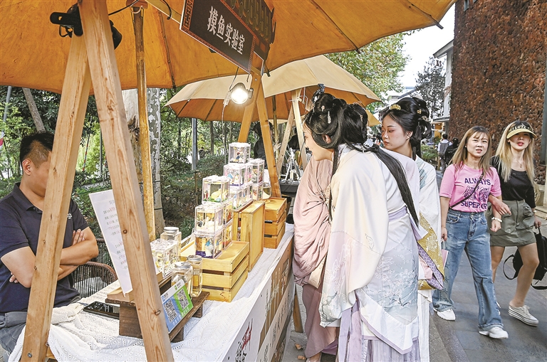 “大运河庙会有两大特点。”从2020年起就在大运河庙会摆摊的木器手作品牌“王拾壹一”负责人说,“一是风景美,秋天在这儿摆摊,就是沉浸式地体验‘桂花味的江南’;二是摆摊的设计师多,同行交流十分愉快,而且来逛庙会的年轻人很多。和全国原创市集相比,大运河庙会可以说是‘顶流’了,人流量很大,但摊位租金不高,很适合年轻摊主。据说去年庙会高峰期时街区人流量达4万多人,我的摊位营业额一天能达2万元。”