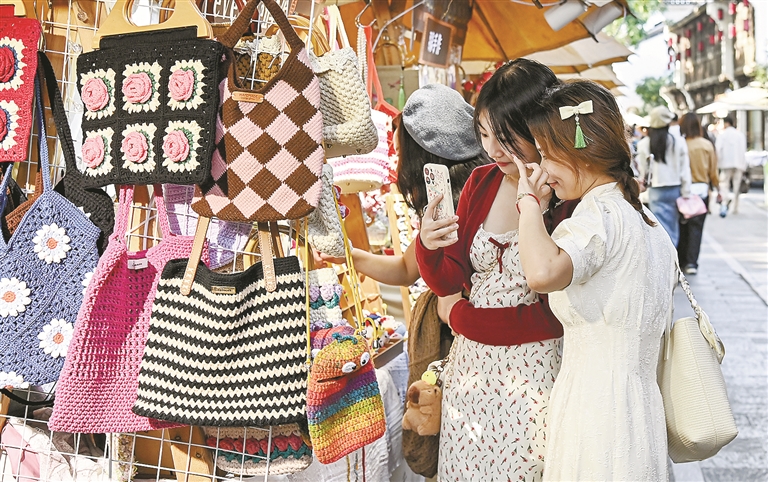 大兜路历史文化街区的“妙享禅市”,是时下大热的“国风担当”。记者在现场看到,来自全国各地的80余家新中式文创、国风潮物、风味美食纷纷“出摊”,复刻螺钿、中药咖啡、香篆技艺……琳琅满目,一应俱全,到处都是穿古风服装来打卡的人。“这个包包还有吗?”现场一位长发女生在一个国风包包摊主面前问道。原来,她是摊主的“老粉丝”了,现在身上背的包就是早些年逛集市在摊主这儿买的,这次听闻摊主来大运河庙会摆摊,她就赶到了现场,一口气买了好几个包。