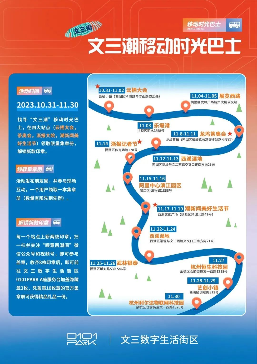 至11月30日截止,来“文三潮”移动时光巴士以下站点,即可盖到对应的两枚印章。四大站点可领取集章册并能解锁一个地标印章和一个老数码印章,一共8枚。