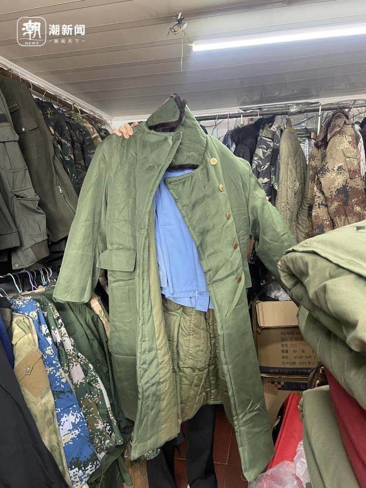上城区军威劳保店,门口的架子上挂了一排各式各样的军大衣。“店里面还有更多款式,价格都不贵的。”老板娘笑着告诉记者,今年军大衣确实突然火了,她在抖音也刷到了大学生穿军大衣的视频。