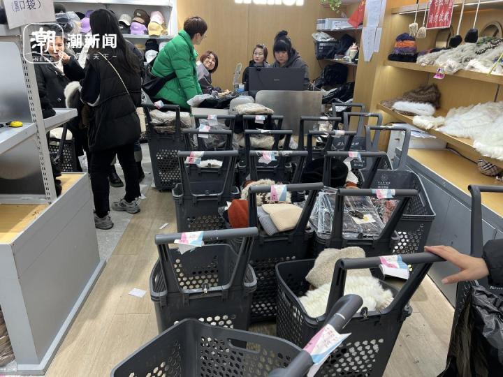 市场内,一家主要售卖帽子和围巾的档口里,收银台前的购物筐排成了一片。员工小张蹲在角落,忙着清点货品。“这个月几乎每天都是工厂一到货,就发走了。发的最好的就是围巾,多的时候一天能发六七万条,像昨天天气比较热,也有两三万条。”