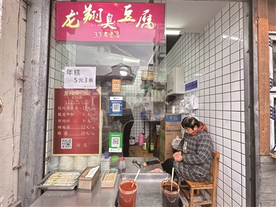 高银街107号的龙翔臭豆腐被称为河坊街必点的小吃之一,店面很迷你,门口却在排队点单,甚至已经排到了隔壁的中药馆门口。七旬老人邵阿姨告诉记者,自己以前是在龙翔附近的小弄堂口摆摊卖臭豆腐,后来才搬到了这里。