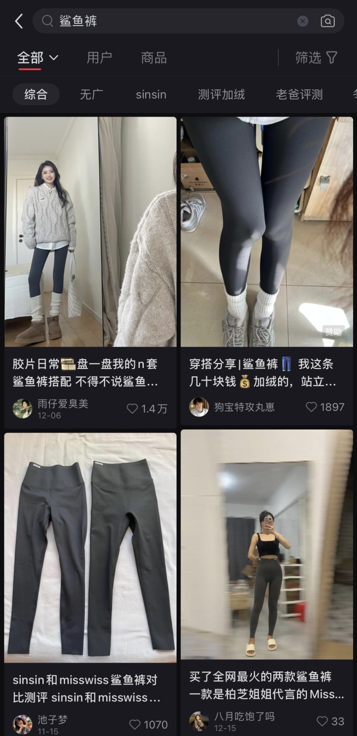 在小红书搜索鲨鱼裤,你就能收获上万条相关测评和穿搭笔记——“秋冬保暖美美通勤人手必备”“我的本命神裤”……