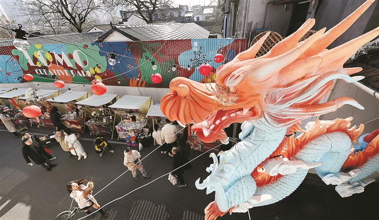 1月12日,一场“齐乐龙龙”新潮年味市集在上城区南星街道馒头山社区笤帚湾63号LOMO创意谷开市。为期三天的新潮年味市集分为民俗潮趣打卡和国潮年味市集两大内容,辖区内文创企业带来了“龙”主题国潮装置、动漫生肖玩偶、改良“土特产”、创新年味美食、手作年俗饰品等各种独具创意的“年货”,让市民游客在这里感受新潮年味,体验花式过年。
