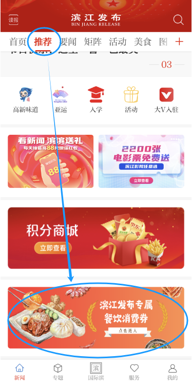下载滨江发布APP,在推荐页面点击“滨江发布专属餐饮消费券”活动入口;