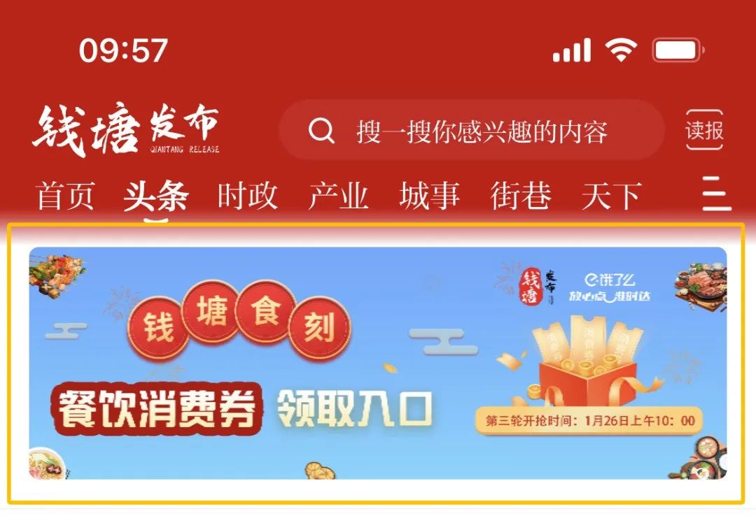 2.头条点击“钱塘食刻 餐饮消费券领取入口”,10点准时开抢,活动入口将提前30分钟放出,记得定好闹钟,并刷新页面哦。