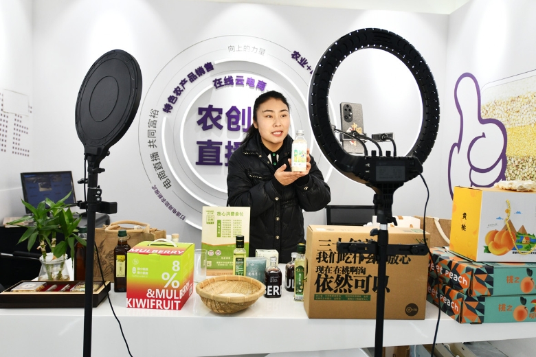 近年来,建德钦堂乡积极开展“乡村主播”培训,着力打造“乡村主播”创业品牌,让手机变成新农具、数据变成新农资、直播变成新农活,助力乡村振兴,促进增收共富。图为钦堂乡田韵家庭农场新农人王运正在直播售卖农产品。