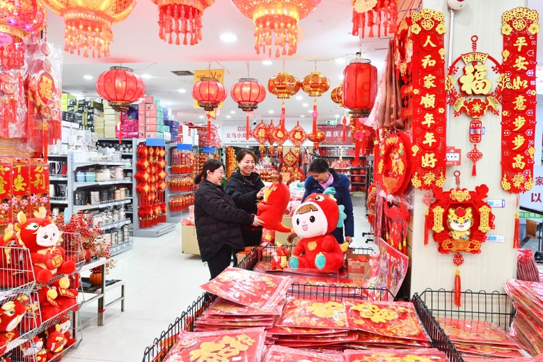 随着春节临近,新安江主城区各大商场、超市内年味越来越浓,前来选购春联、福字、窗花等喜庆饰品的市民络绎不绝,以此迎接龙年新春的到来。