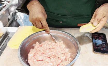 鸡蛋液在铜勺上滚一圈,一张蛋皮就做好了,包上肉末,对折做成饺子形状。小的1元5个,大的1元2个。