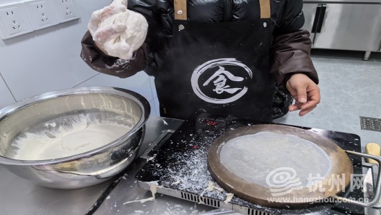 在东山弄市集就有一家现做春卷饼皮的,15元一斤,大约有40多张。包好的成品无论咸甜,都是10元一盒,一盒有10个。正在做饼皮的大姐告诉记者:“春卷皮好不好吃,面糊是关键。面粉、水、食用盐按照特定比例调和成面糊,太厚不行,太稀也不行,要保持面糊在手上流动又不能流下来。”