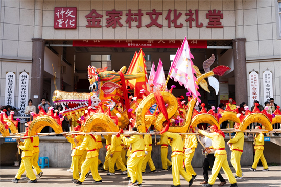 据了解,富春江镇金家村板龙起源于明朝,威武神气,深受百姓喜爱。这次表演的板龙是全新制作的,花了一个半月的时间,由108块板凳拼接而成。每块板凳上矗立着一节弯曲的龙身,造型美观、栩栩如生。