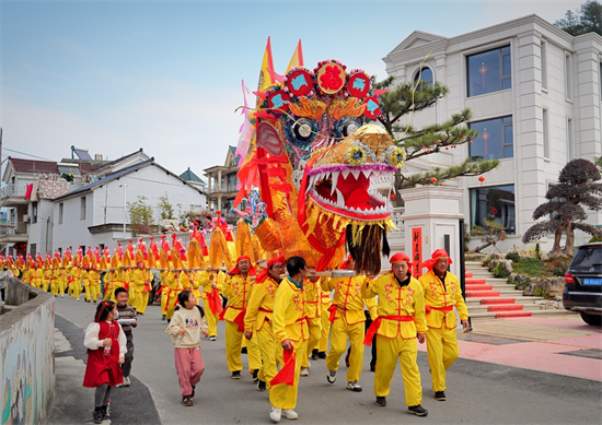 2月17日,近200米的板龙队伍,在桐庐富春江镇金家村村委院子绕行几圈,接着穿过村庄、田野,为村民送去新春祝福。