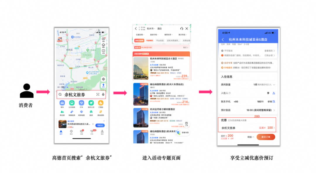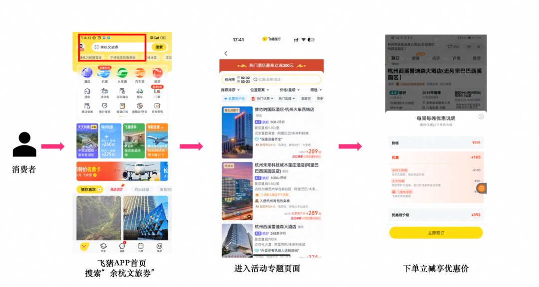 在飞猪旅行APP、高德地图APP搜索“余杭文旅券”,下单带有“余杭文旅券”标签的产品即可参与活动。包括杭州良渚君澜度假酒店、杭州余杭万豪行政公寓等高星级酒店及无它心舍、杭州西溪花间堂等40余家特色民宿酒店和山沟沟等景区,最多可享640元的消费券优惠折扣。