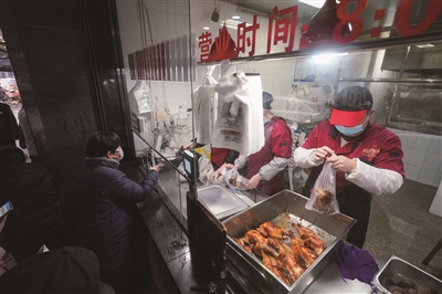 “大家排好队伍,今天下雨,注意别淋湿了。”2月28日中午,杭州下着小雨,气温也不太友好。不过,位于吴山路附近的吴山烤禽门前,却排满了购买烤鸡的市民。由于阴雨不断,店员也时刻提醒顾客注意防雨。