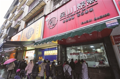 采访当天虽然天气并不友好,但记者数了数,吴山烤禽(吴山店)门前足足有二十多位顾客。他们打着伞,有人不时伸长脖子张望着,看看还要多久才能轮到自己。每当前面一位顾客离开,队伍最后往往又会新增几名顾客。
